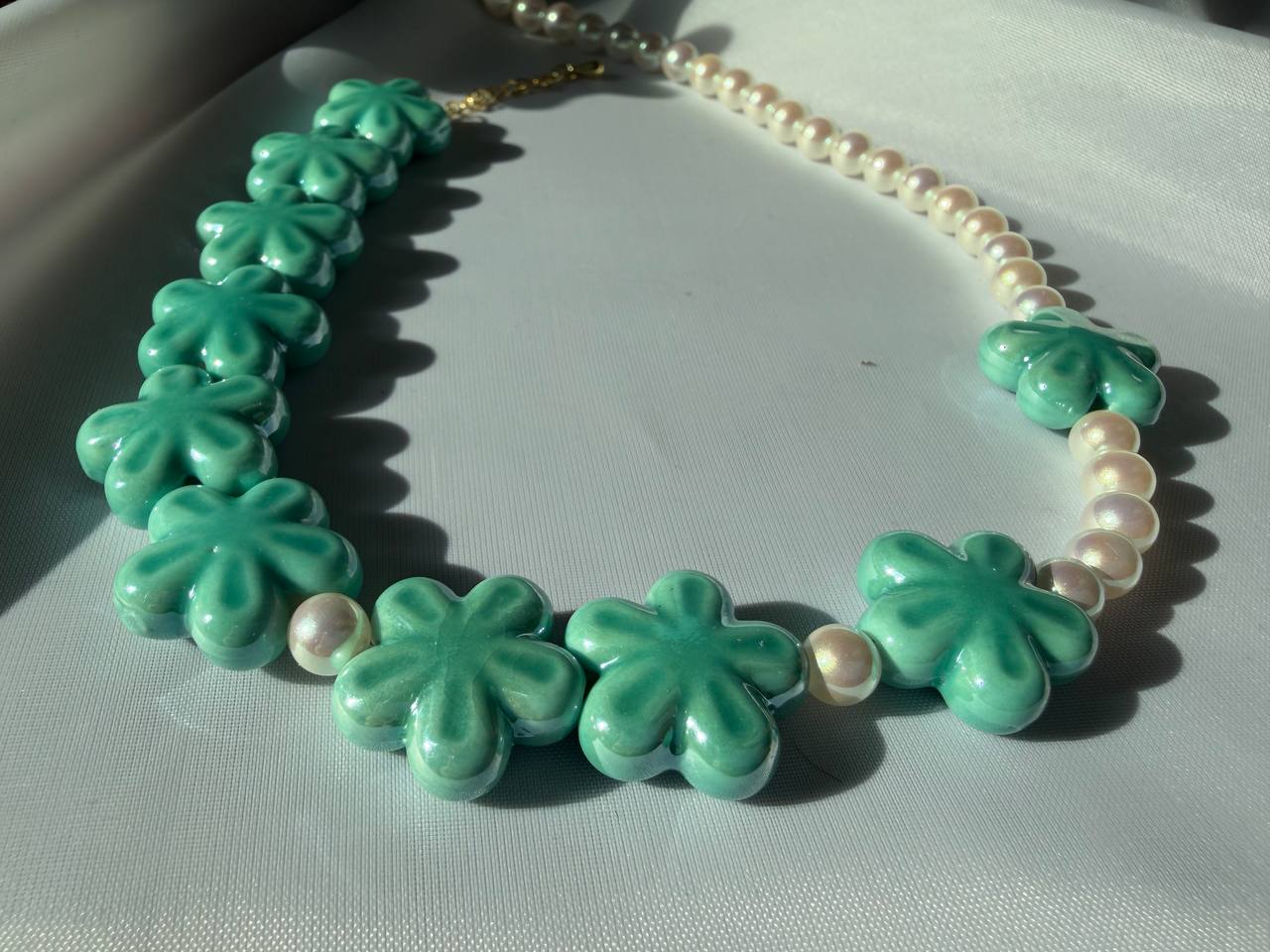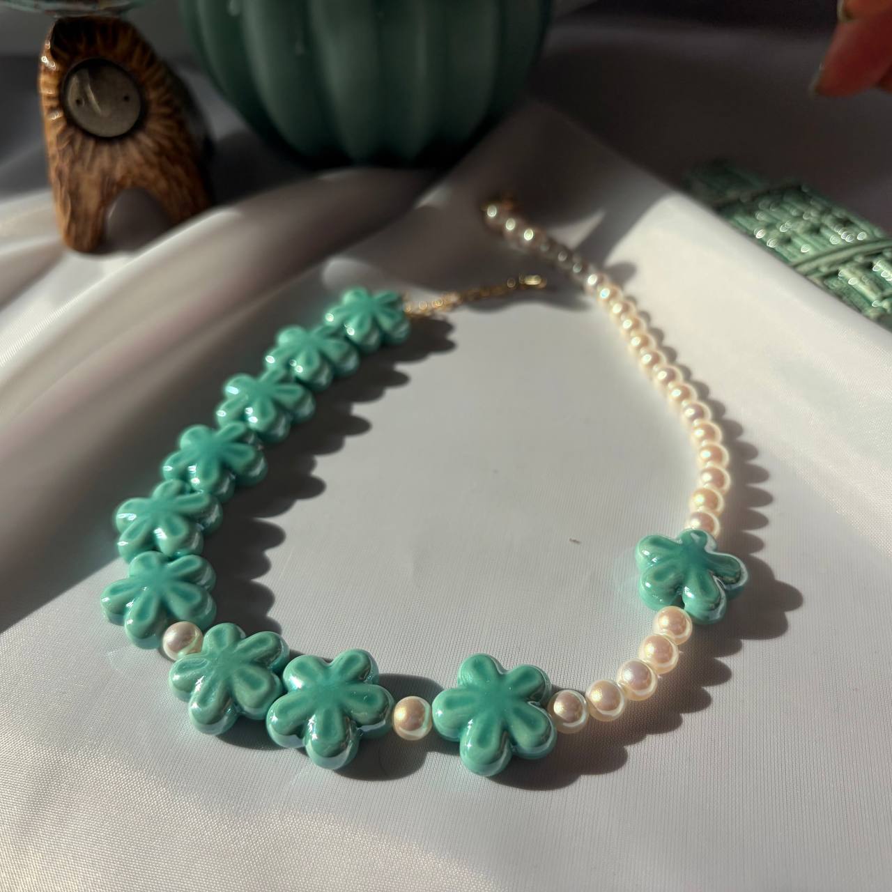 Колье "Fleur de Mer". Нежное сочетание матовой теплоты керамических цветов и холодного благородства натурального жемчуга. Бирюзовый оттенок напоминает о морском бризе, а ручная работа вкладывает душу в каждый лепесток. Идеально для летних прогулок или дополнения романтического образа.