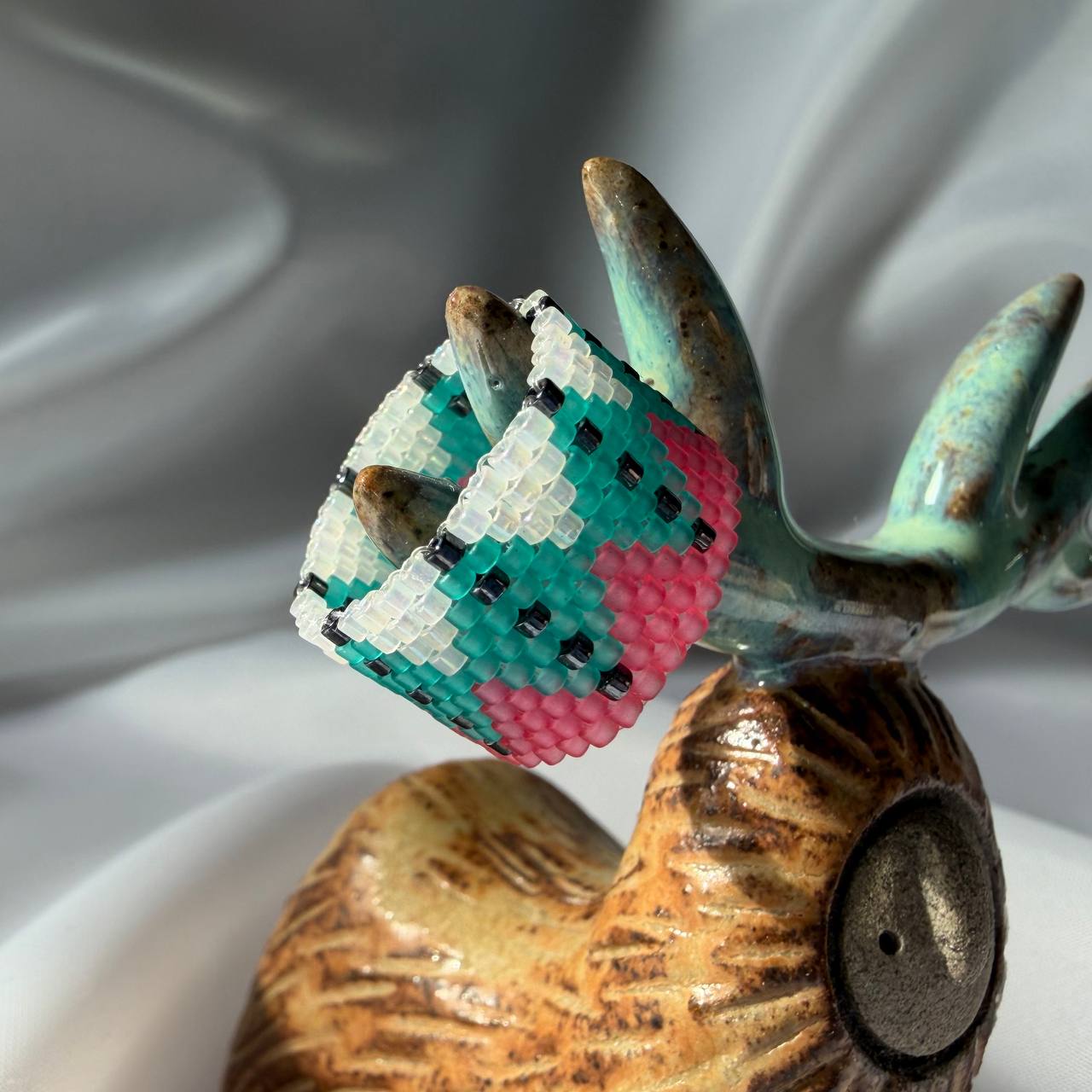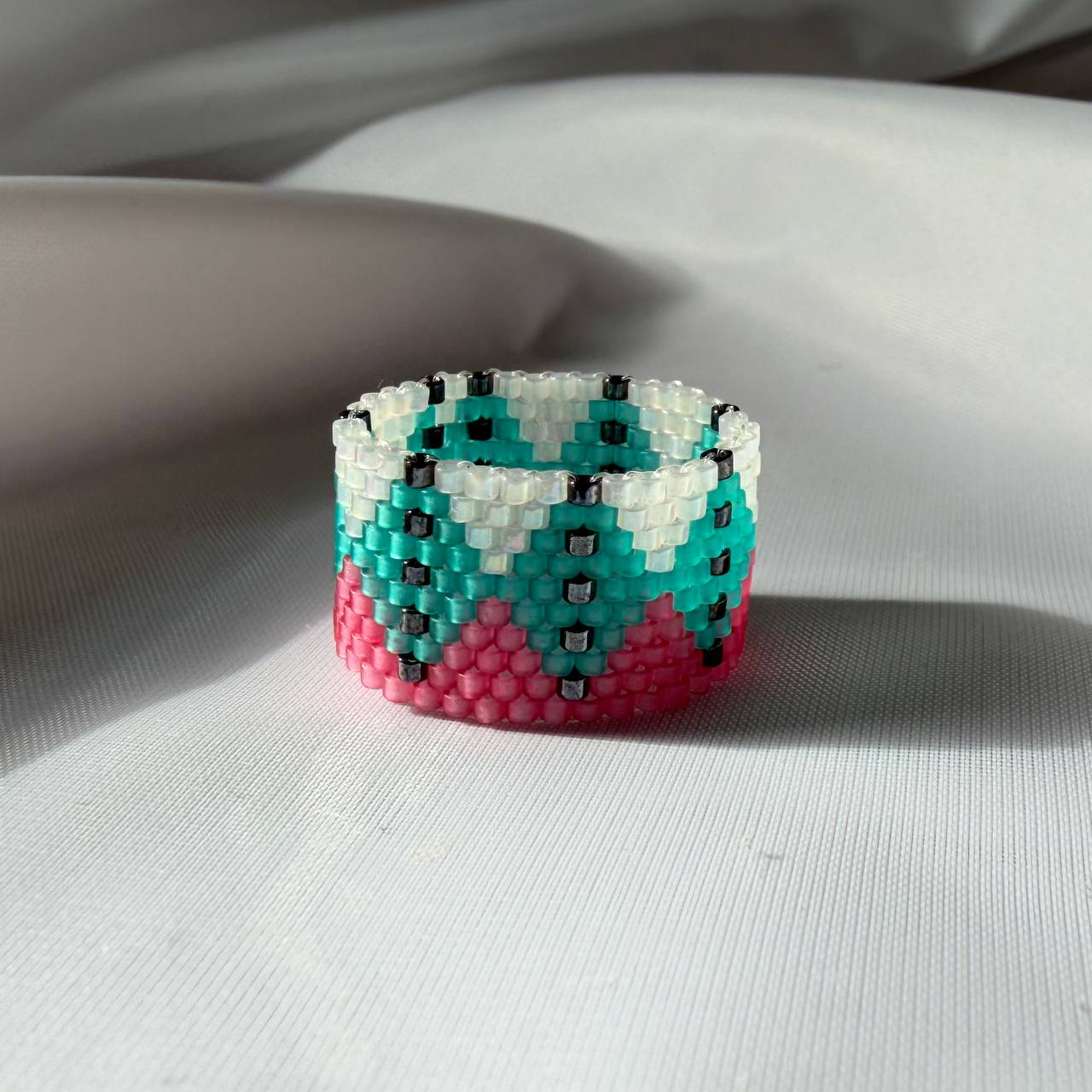 Кольцо "Zigzag". Геометрия в ярких красках. Плотное плетение из бисера с графичным зигзагообразным узором. Сочетание бирюзового, розового, белого и чёрного создаёт эффект движения и энергии. Смелое заявление для тех, кто любит быть в центре внимания. Носите соло как акцент или сочетайте с минималистичными кольцами.