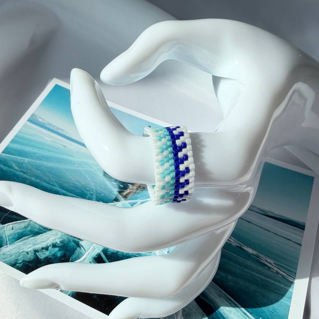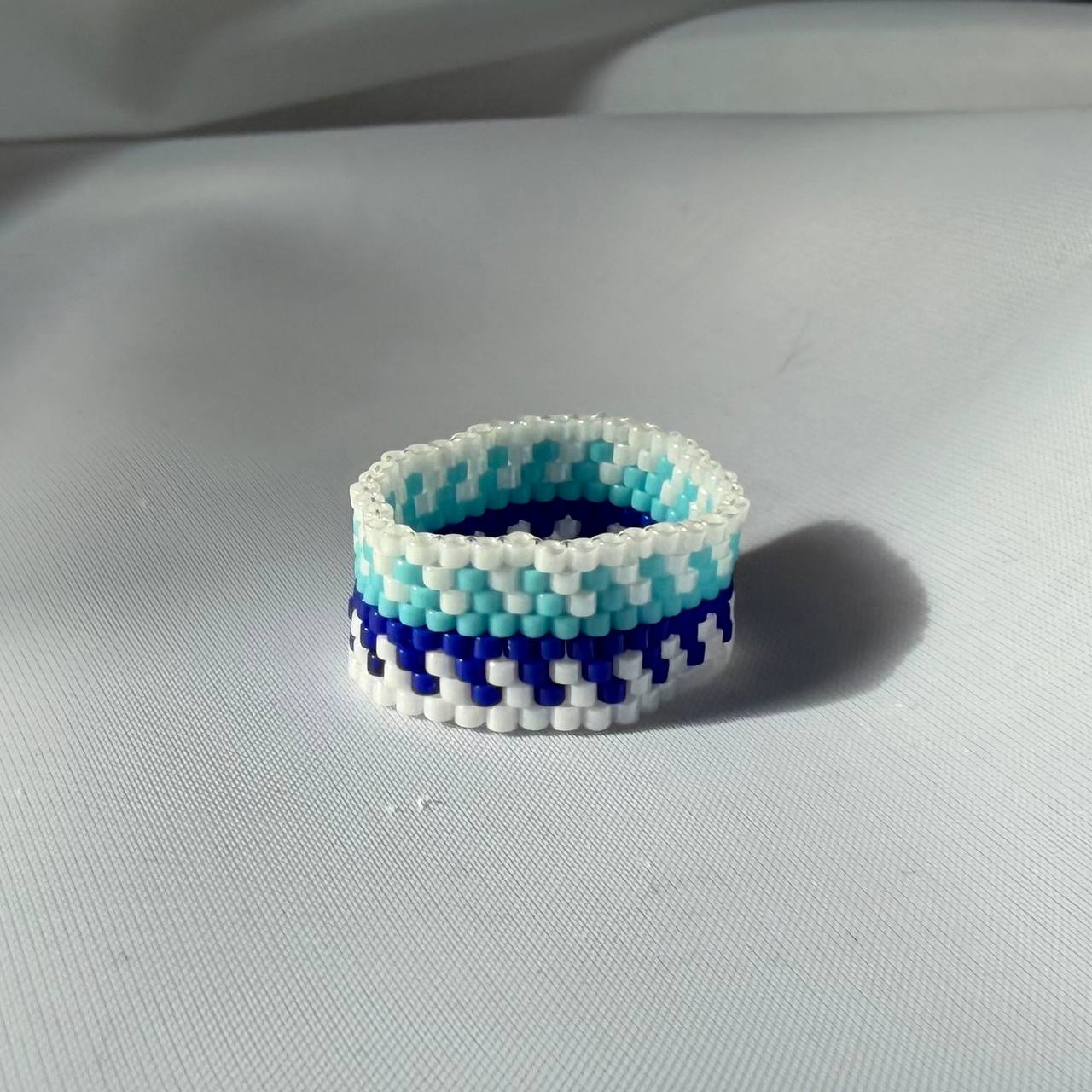 Кольцо "Ocean Waves". Свежесть морских волн в геометрическом узоре. Три оттенка — белый, бирюзовый и глубокий синий — создают эффект водной глади и морских глубин. Плотное плетение из бисера делает кольцо удобным для повседневной носки. Для тех, кто мечтает об океане.