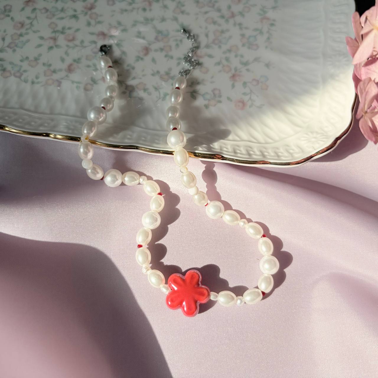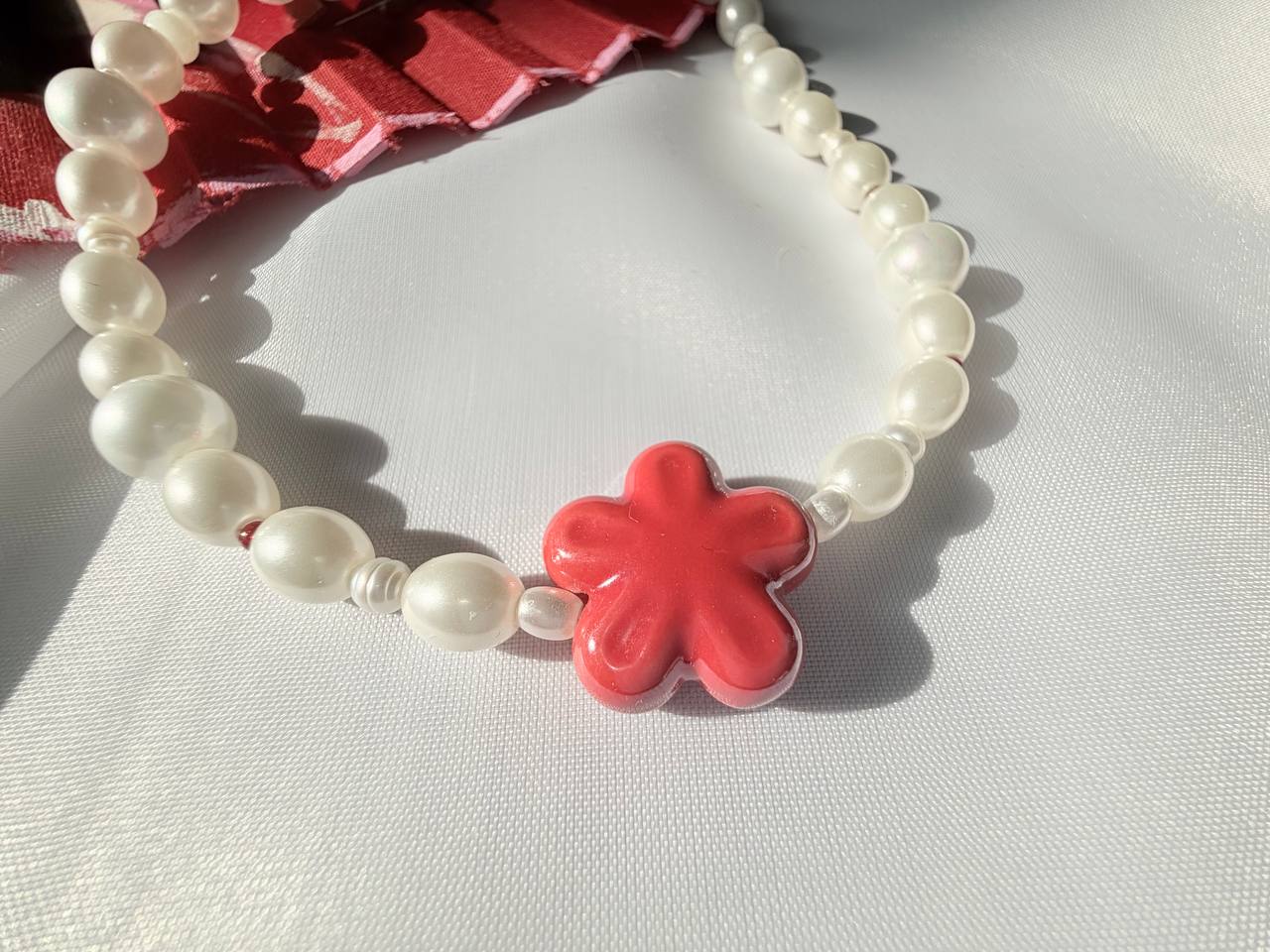 Колье "Кокетка". Элегантность с характером. Белый жемчуг в сочетании с ярко-красным цветком создаёт ощущение лёгкости и женственности. Идеально для романтических образов и тех, кто любит сочетать классику с игривыми акцентами.