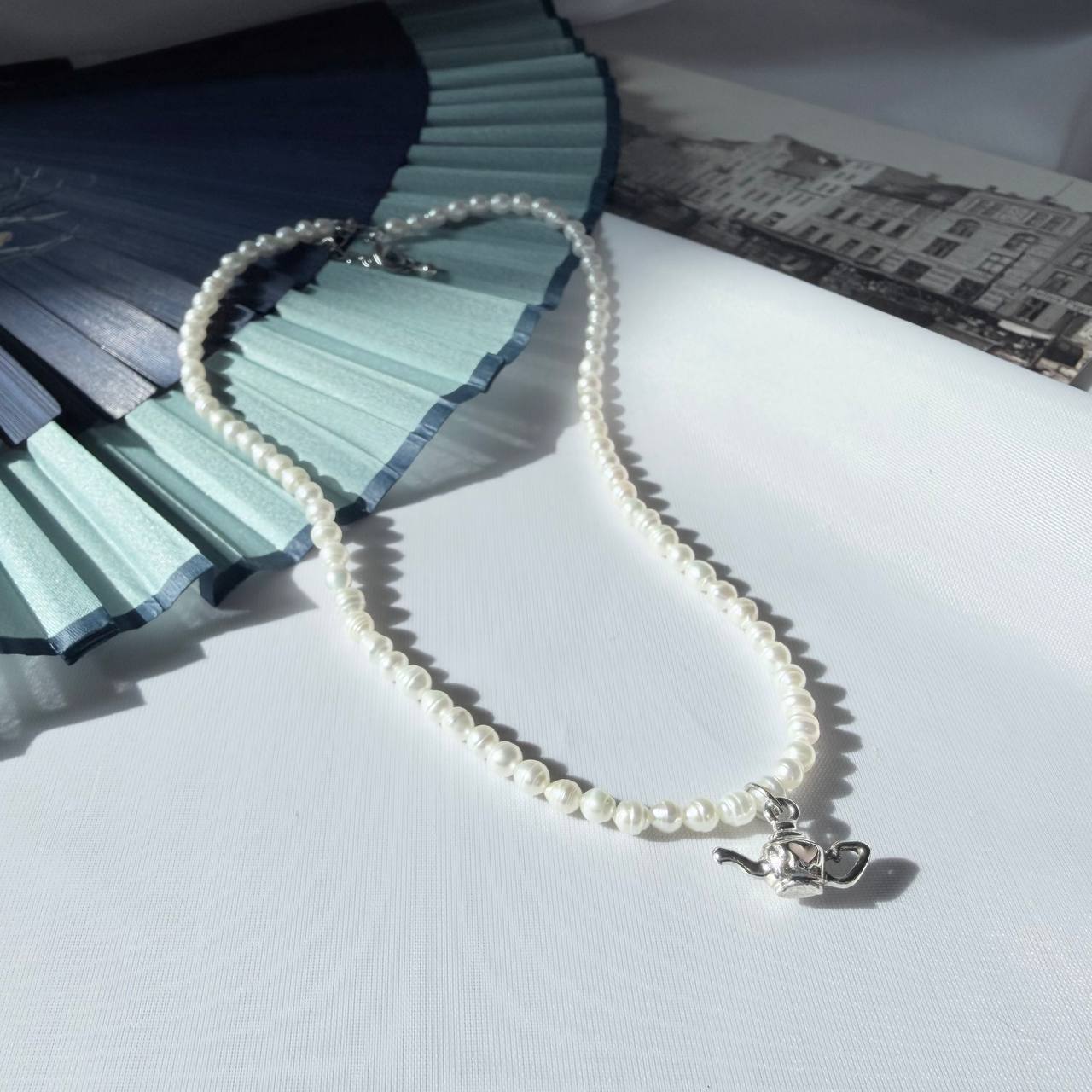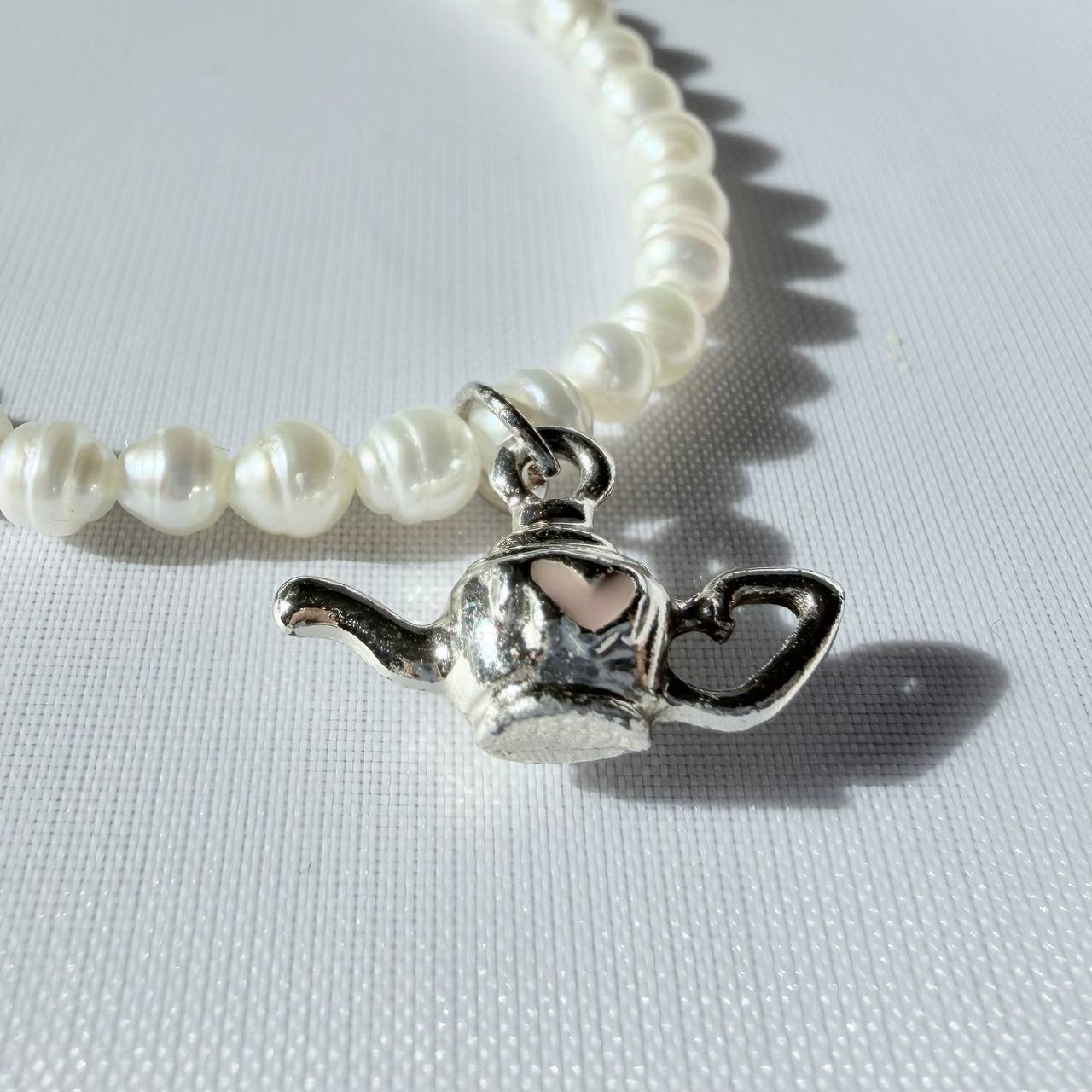 Колье "Tea Time". Уют в каждой детали. Белый жемчуг с миниатюрным серебряным чайником создаёт ощущение домашнего тепла и английских традиций. Идеально для любителей чая, винтажной эстетики и тех, кто ценит маленькие радости жизни.