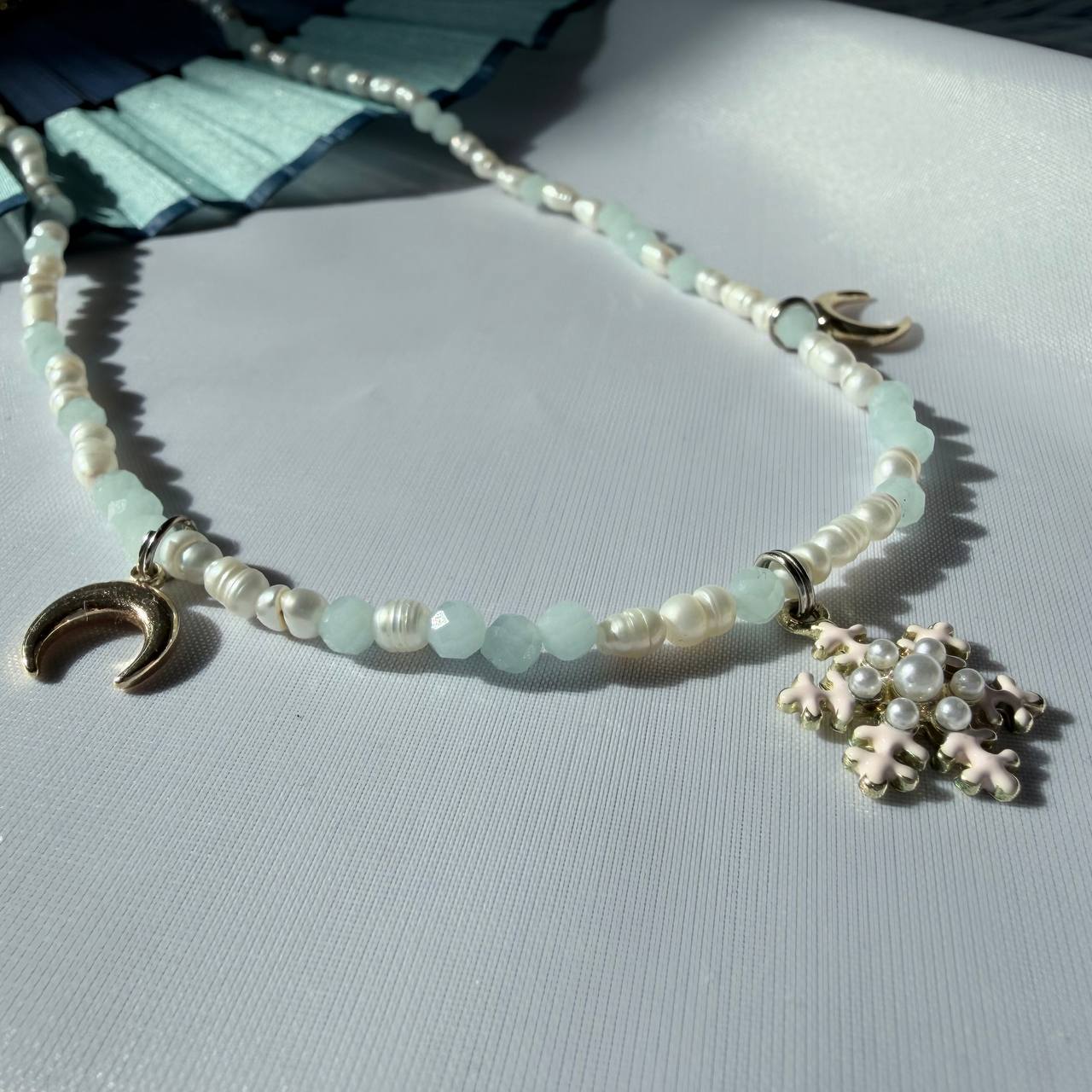 Колье "Winter Dreams". Зимняя магия в каждой детали. Белый жемчуг и голубые бусины дополнены полумесяцами и снежинкой, создавая ощущение холодного зимнего утра. Лёгкое, воздушное, невероятно романтичное. Идеально для тех, кто мечтает о зимней сказке.